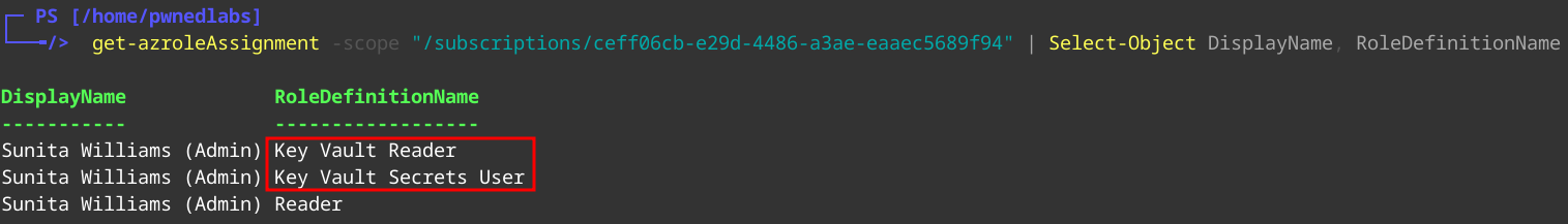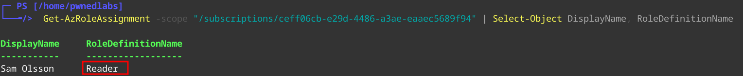 Get-AzRoleAssignment -scope "/subscriptions/ceff06cb-e29d-4486-a3ae-eaaec5689f94" | Select-Object DisplayName, RoleDefinitionName