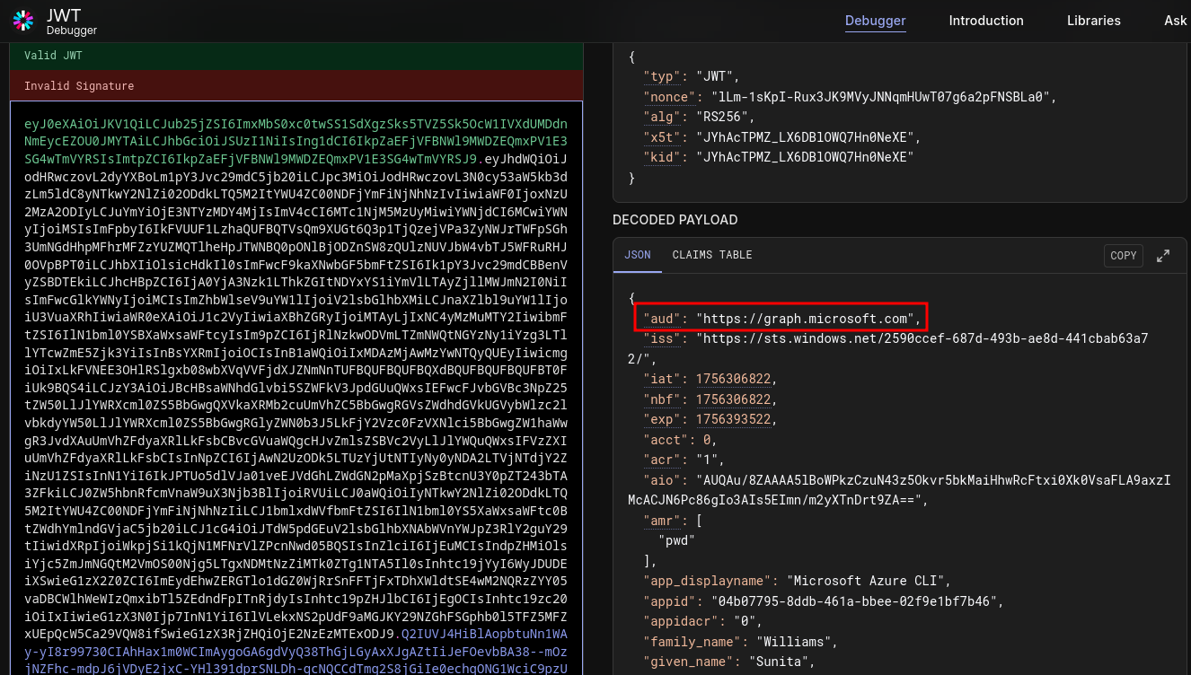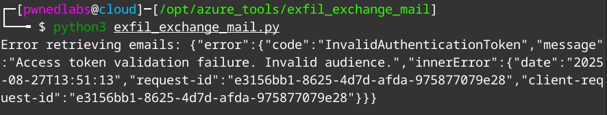 We see there is an issue with the token we supplied. Having a closer look into the script we see the requirement of the token audience “https://graph.microsoft.com”