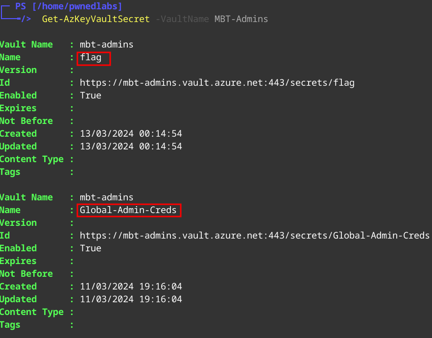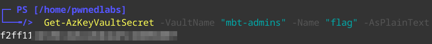 Get-AzKeyVaultSecret -VaultName "MBT-Admins" -Name "flag" -AsPlainText