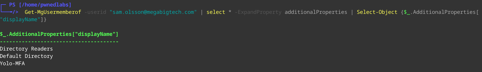 Get-MgUserMemberOf -Userid "sam.olsson@megabigtech.com" | Select * -ExpandProperty additionalProperties | Select-Object {$_.AdditionalProperties["displayName"]}