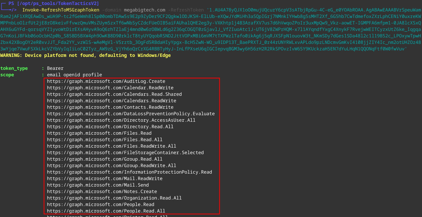 Invoke-RefreshToMSGraphToken -domain megabigtech.com -RefreshToken ‘Refreshtoken’