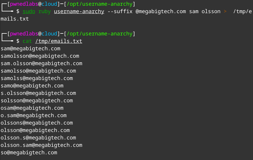 sudo ruby username-anarchy --suffix @megabigtech.com sam olsson > /tmp/emails.txt
